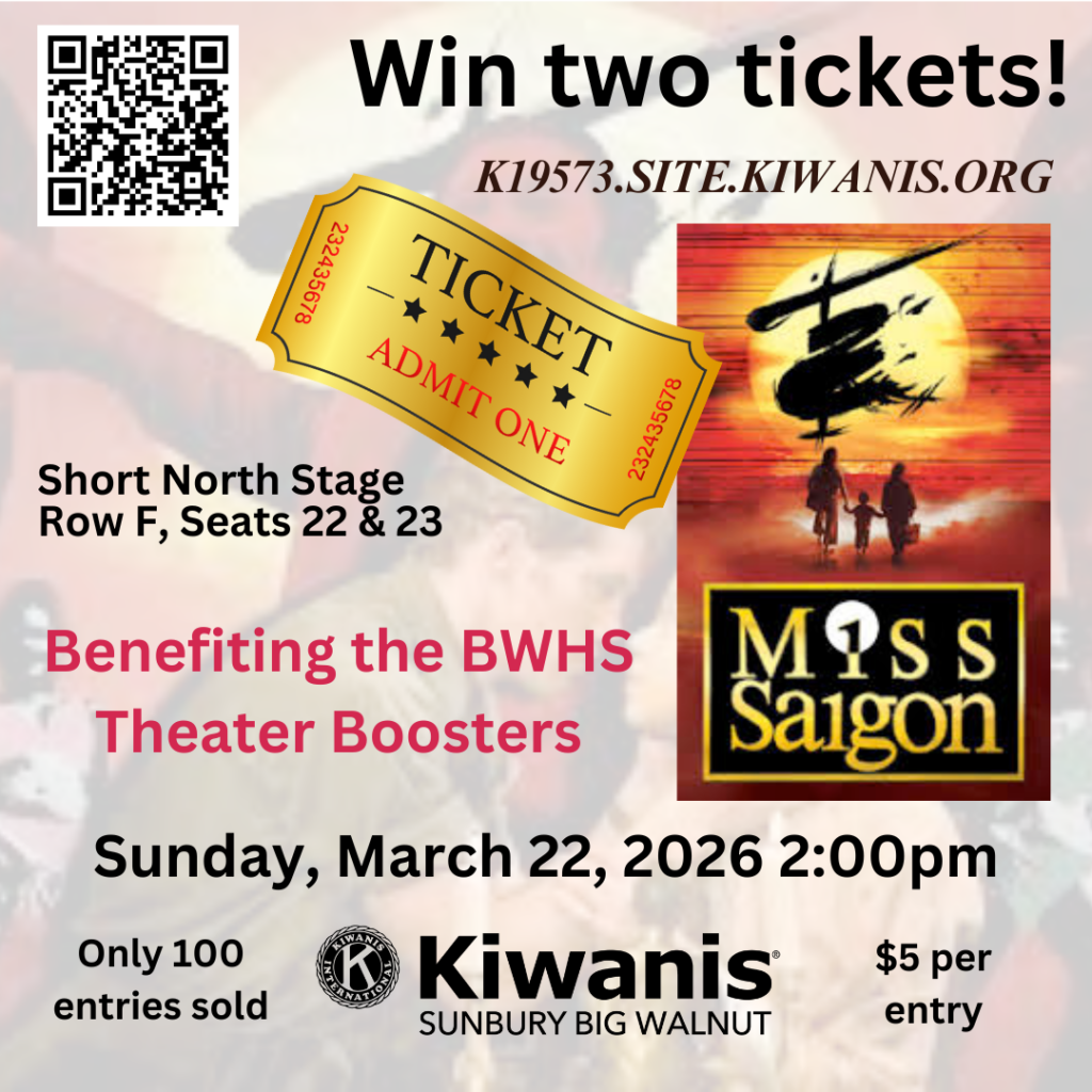Up next is a 2-pack of tickets to Miss Saigon at the Short North Stage. 100% of the revenue from this raffle will support the Big Walnut High School Theater Boosters as the tickets and raffle ticket processing fees are all being donated by Kiwanis.